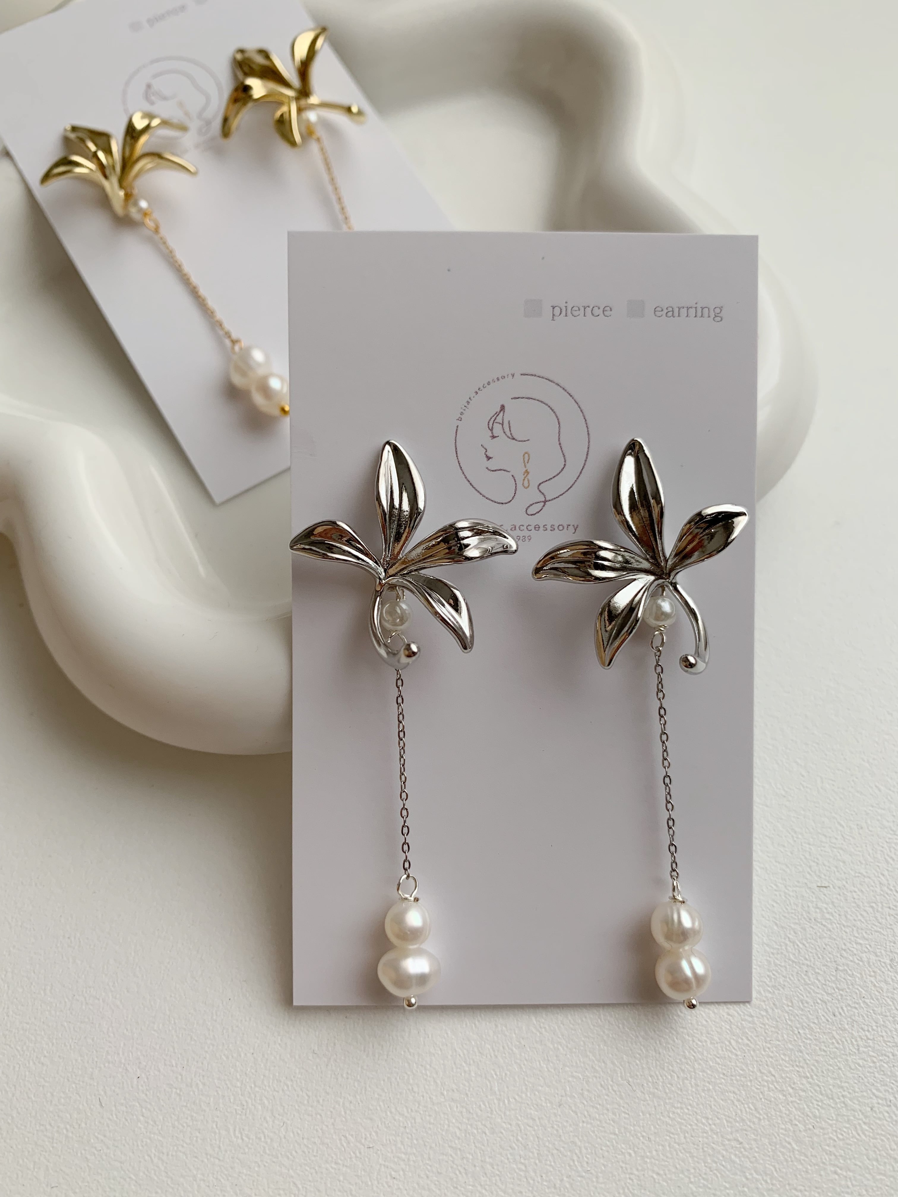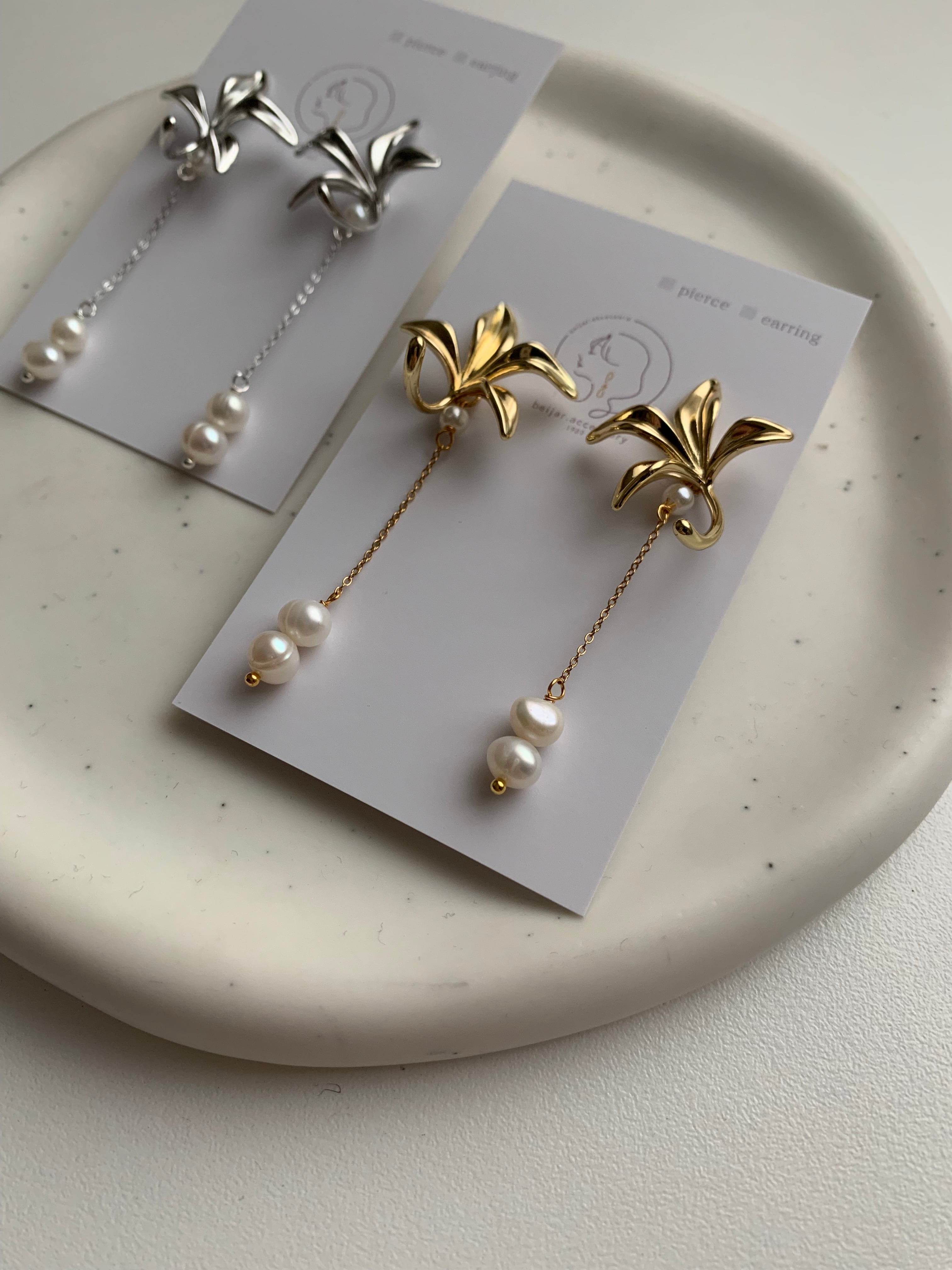 大ぶりの花びらモチーフから、繊細なチェーンとパールが揺れ落ちるデザイン。